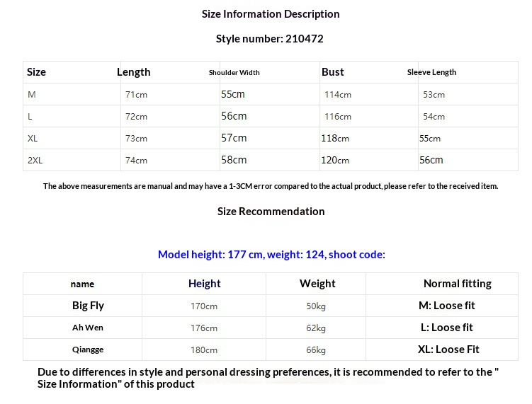 1. Asian sizes are 1 to 2 sizes smaller than European and American people. Choose the larger size if your size between two sizes. Please allow 2-3cm differences due to manual measurement. 2. Please check the size chart carefully before you buy the item, if you don't know how to choose size, please contact our customer service. 3.As you know, the different computers display colors differently, the color of the actual item may vary slightly from the following images.